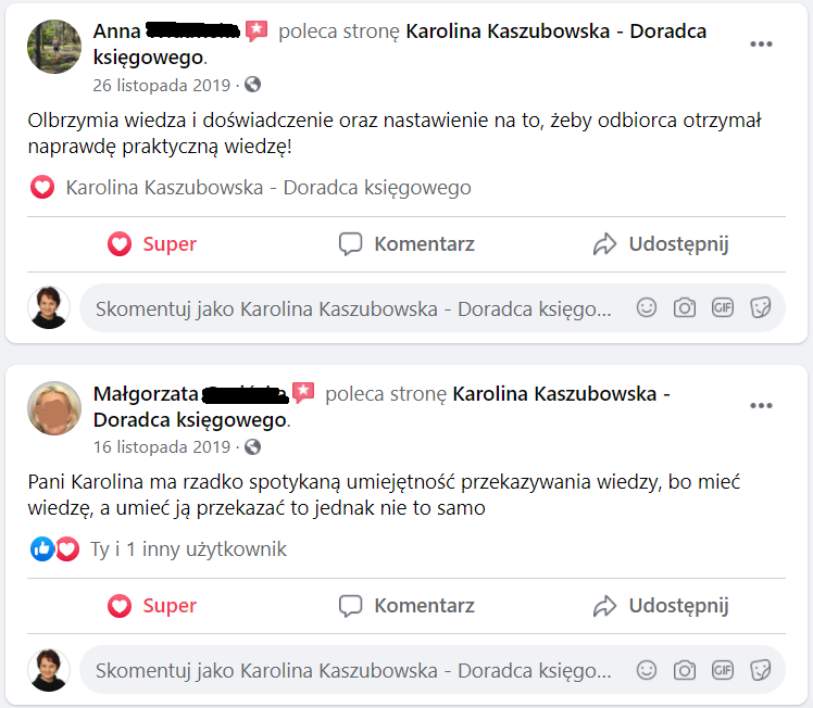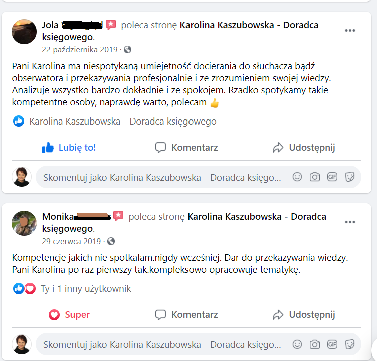 Do tej pory przeszkoliła kilkaset osób w ramach dwóch głównych kursów online – Samodzielnego księgowego i Głównego księgowego – dyrektora finansowego a w jej webinarach wzięło udział kilka tysięcy księgowych.